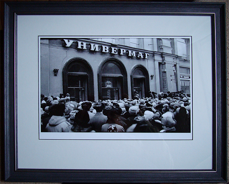 "Покупатели у магазина. Минск. Гум. 1990 г." (оформление: в раме 53х43 см, с паспарту, под стеклом), -